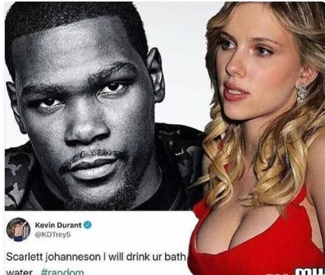 值得一提的是,杜杜兰特对于女明星的喜爱是有历史的,杜兰特最早和寡姐斯嘉丽-约翰逊的渊源来自于雷霆时期,2011年金球奖颁奖典礼,斯嘉丽走红毯时,杜兰特发了一条推特:“斯嘉丽-约翰逊,我想喝你的洗澡水。”