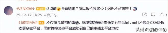 不仅仅是价格的事情。咪咕想趁着价格低要五年合同,而且不想让CBA版权卖更多家平台,同时管控某些平台威胁到自己的主播出平台地位。